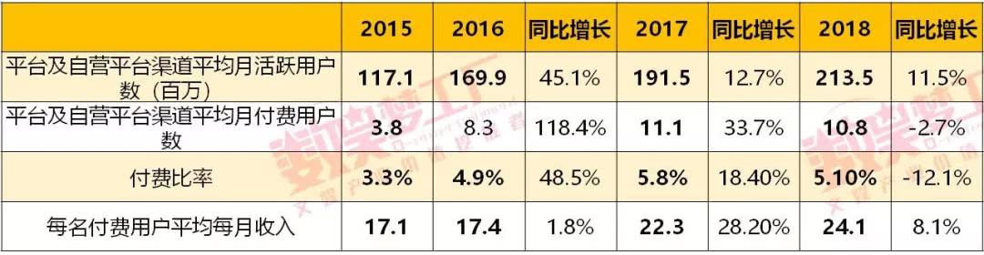 但与这样的付出不成正比的是付费用户数量却出现了多年来的第一次下降,平台及自营平台渠道平均月付费用户数从2017年的1110万下降至2018年的1080万,付费比率从5.8%下降至5.1%。