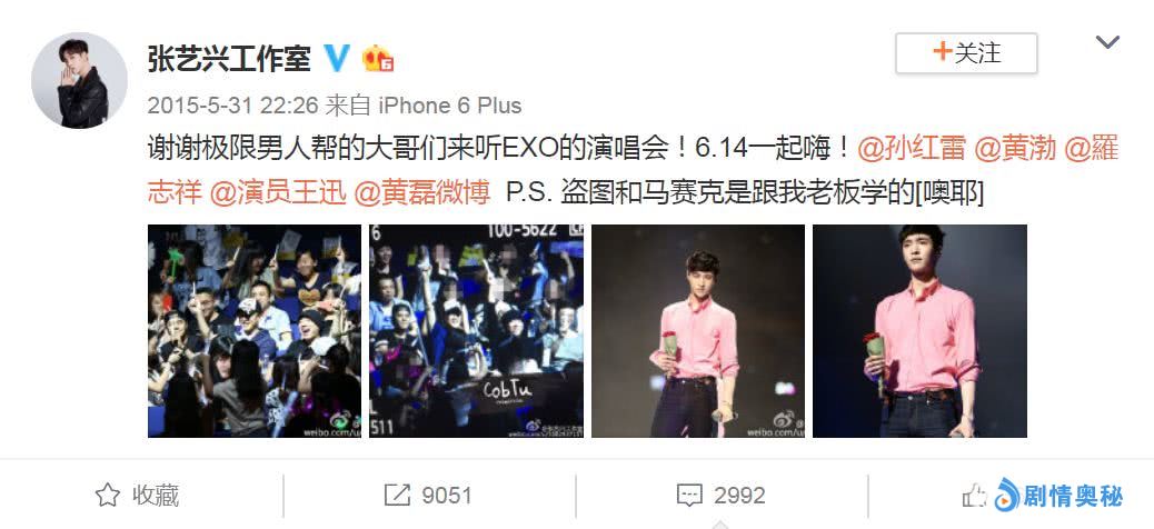 15年张艺兴开演唱会,极限男人帮竟然全部到场为他打call。