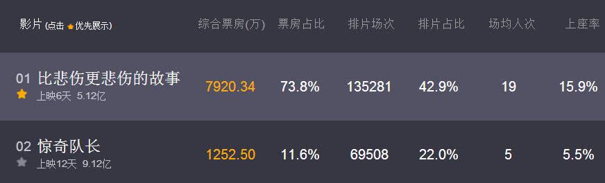 虽然到了3月19日《比悲伤更悲伤的故事》单日票房已经下跌到了7920万,但是依然是轻松的夺得了当天的单日票房冠军,把排在第二的《惊奇队长》轻松压制。而且《比悲伤更悲伤的故事》上座率依然达到了15.9%,预计影片还有一波票房爆发期。