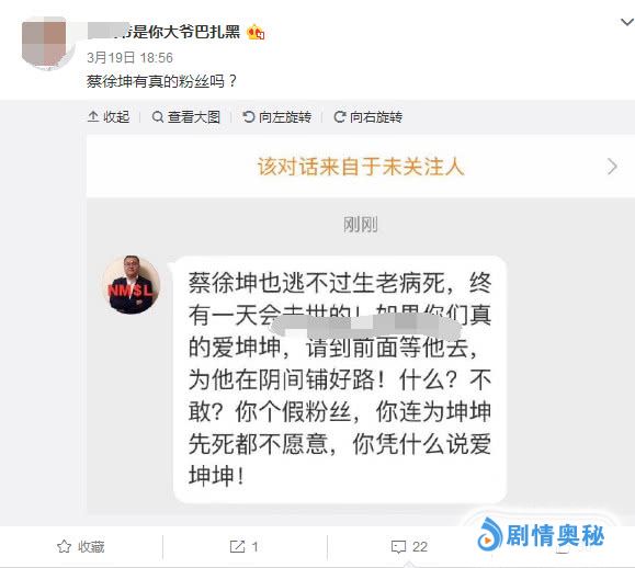 3月19号,有网友曝光了蔡徐坤粉丝发的私信内容,这个粉丝说:蔡徐坤也逃不过生老病死,终有一天会去世的,如果你们真的爱坤坤,请到前边等他去,为他在阴间铺好路!什么?不敢?你个假粉丝,你连为坤坤先死都不愿意,你凭什么说爱坤坤。