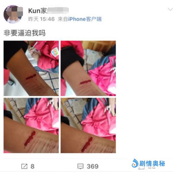 蔡徐坤的一个女粉丝居然动手割腕了,手腕上都是一道道伤疤,冒出血了。这个女粉丝气愤说:非要逼迫我吗?这些粉丝都是怎么了?为了一个看不见、摸不到的人闹自杀,脑子进水了吗?