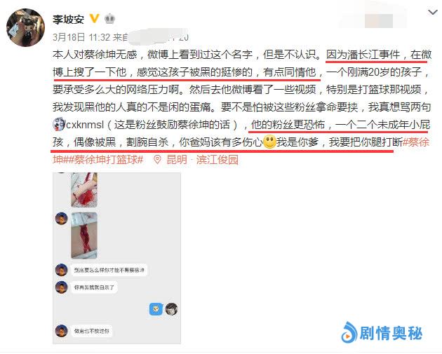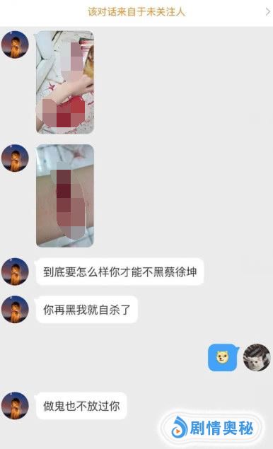 多个网友曝光了蔡徐坤粉丝闹自杀的事件,这些粉丝拿自己的性命给别人发私信,以此来威胁网友。爆料者怒斥:他的粉丝更恐怖,一个两个未成年小屁孩,偶像被黑,割腕自杀,你爸妈该有多伤心!我要是你爹,我要把你腿打断。