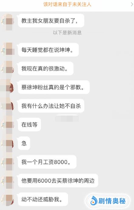 还有网友爆料自己女朋友是蔡徐坤粉丝,一个月工资8000,她要用6000元买蔡徐坤周边物品,不让女朋友购买,对方就威胁闹自杀。