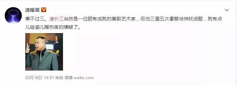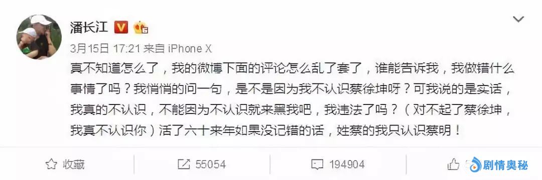 3月15日,”不堪其扰“的潘长江微博发文,求问网友:“我的微博下面的评论怎么乱了套了,是不是因为我不认识蔡徐坤呀?我违法了吗?”