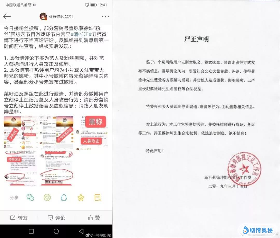 左:反黑组相关微博,右:蔡徐坤工作室官方声明