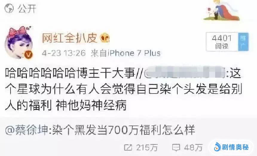 不仅是明星,普通网友也常常一不小心就成了粉丝的“众矢之的”。去年4月,蔡徐坤发布的微博:“染个黑发当700万福利怎么样”被某位普通网友转发吐槽:“这个星球为什么有人会觉得自己染个头发是给别人的福利,神经病”。