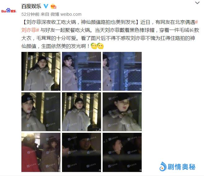 3月20日,有媒体在微博更新了一组刘亦菲在北京吃火锅的路透图。“刘亦菲深夜收工吃火锅,神仙颜值路拍也美到发光......生图依然美的发光啊!”