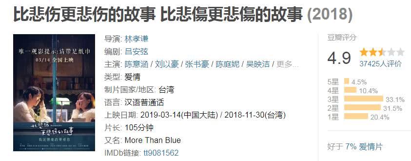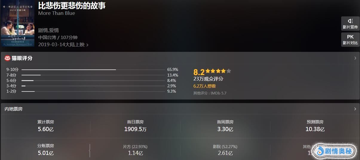 《比悲伤更悲伤的故事》上映7天就狂收了5.6亿以上,按这个火热态势最终收10亿真没难度,投资嘴都要笑歪了。该片票房是按进口片比例分账,要是按国产片分账比例算片方2.2亿到手,港台电影要想利益最大化走合拍片道路才是最划算的。这部台湾片不知不觉中还创下一个纪录,豆瓣4.9分是口碑扑街电影中票房最卖座之一。