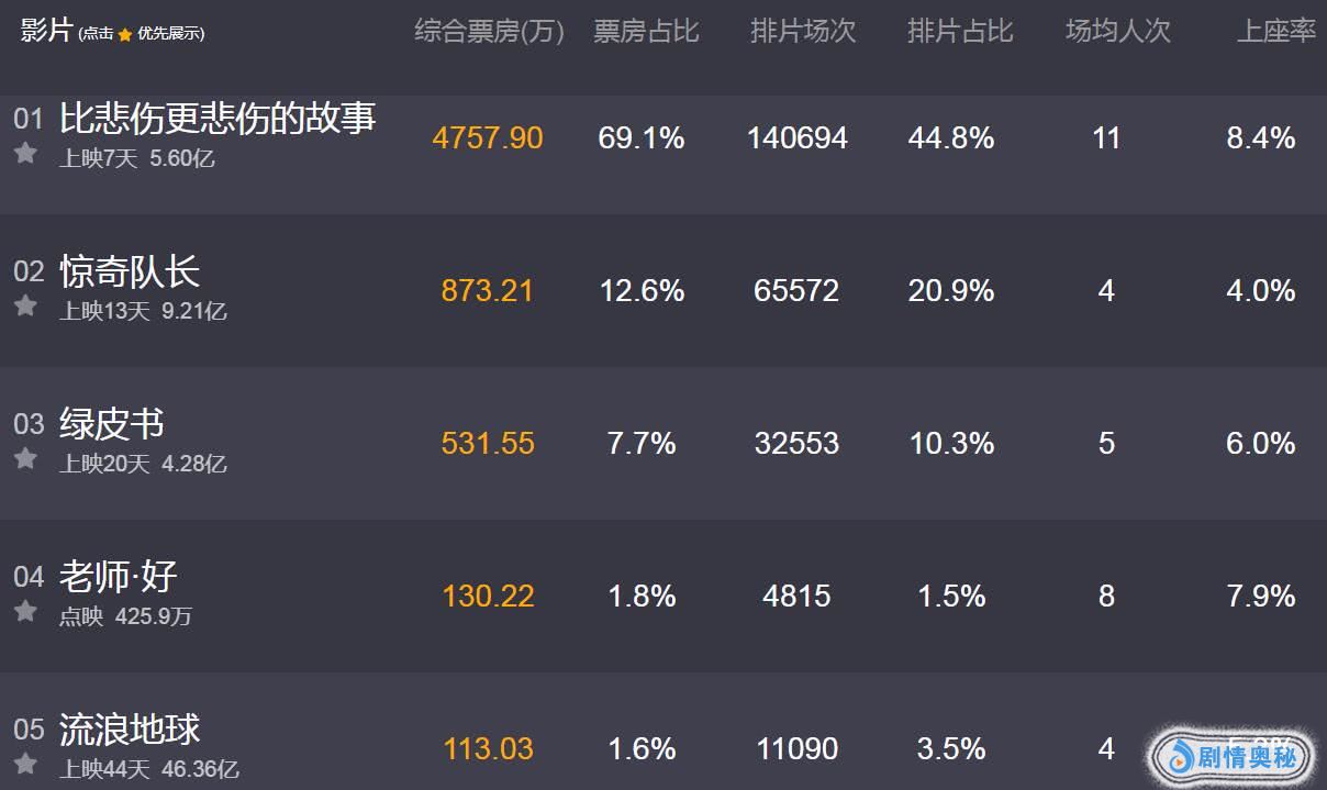 《比悲伤更悲伤的故事》现在取得的票房不算太爆,但结合当下低迷的影市它的票房很逆天了,要知道漫威《惊奇队长》场均也就几人次上座率,对比之下小编感叹女性观众真的力量太强大了。口碑扑街,票房却大爆,“人傻钱多速来”这句话放到现在依旧还有市场。吴京的崛起让很多观众消费变理性了,但很多女性观众真无可救药了,冯小刚口中的“垃圾观众”有她吧?