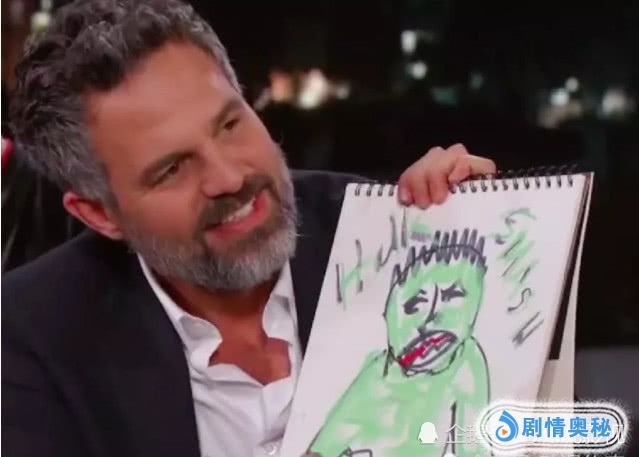 接着是绿巨人浩克的自画像了,看到这画面不得不说,马克叔真的是十分可爱的,要不是一身绿色的皮肤,还真认不出是绿巨人,还有这身材是缩水版的绿巨人吗?