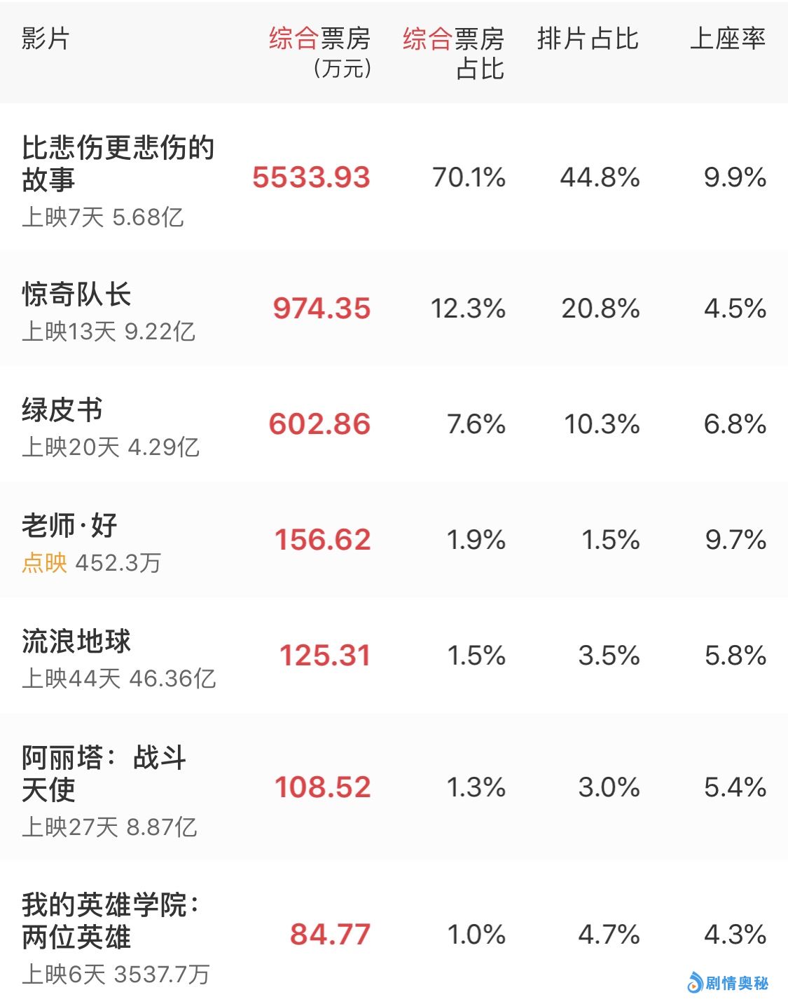 从票房成绩来看,目前国产爱情片《比悲伤更悲伤的故事》在单日票房成绩上遥遥领先,除了上映的第1天之外,后面连续6天拿下单日票房冠军,目前上映7天总票房达到了5.7亿,打败多部好莱坞大片,算是给国产片争了一口气了吧。