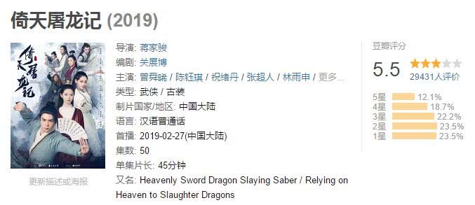 今年的这一版,主演都是新生代小生小花,以网剧的形式播出,目前更新到26集,播放量已经达到了23亿多,豆瓣上有近三万网友进行评价,综合评分为5.5,该剧一上线就被网友吐槽慢动作太多,评分一度低到5.0,但随着赵敏的上线,评分开始回升。