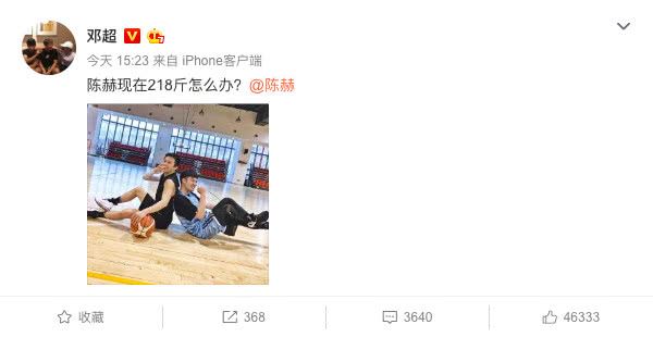 日前,邓超在微博晒出与陈赫背靠背坐在篮球场的照片,配文:“陈赫现在218斤怎么办?”并艾特陈赫。