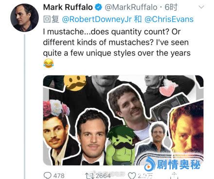 而令人眼前一亮的竟然是,扮演绿巨人的马克·鲁法洛,马克叔这张照片既显年轻又十分帅气,看来赢家已经出现了。不过马克叔这些年来的胡子可以说是越来越多,他也酷爱留胡子。所以他这样回应:胡子多算赢吗?或者我还留过各种不一样的胡子。并且发了一张他各种胡子的照片,网友表示:马克叔年轻时太帅了!