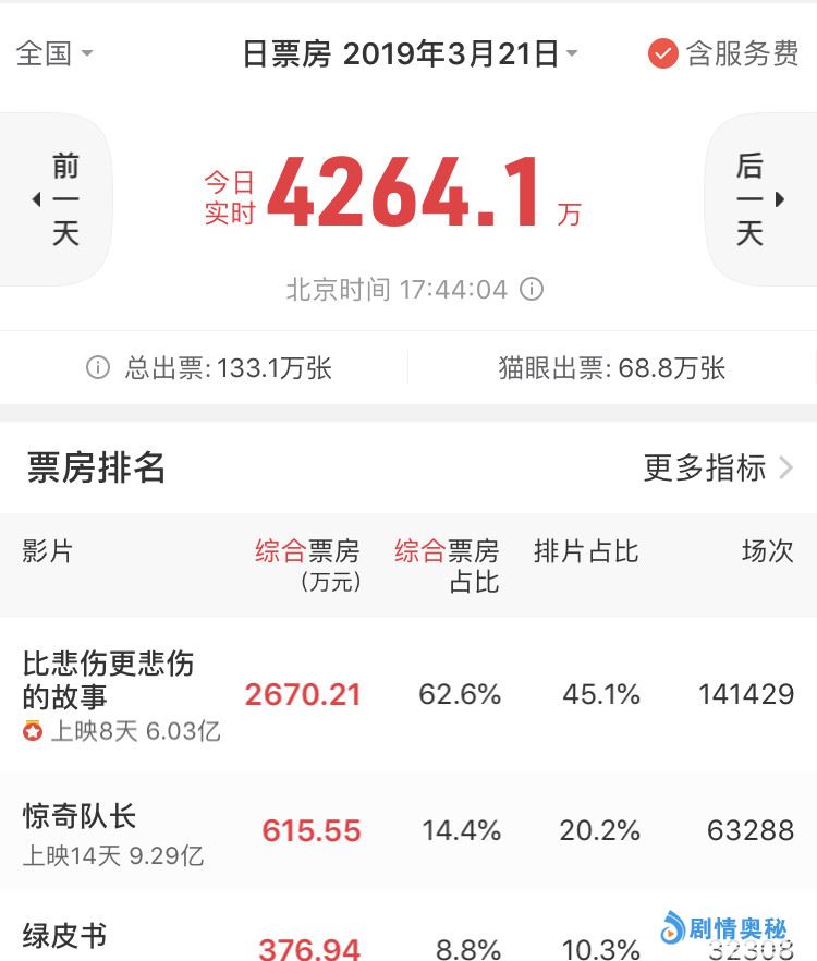 在排片上更是超越了《惊奇队长》两倍之多,占据首位。