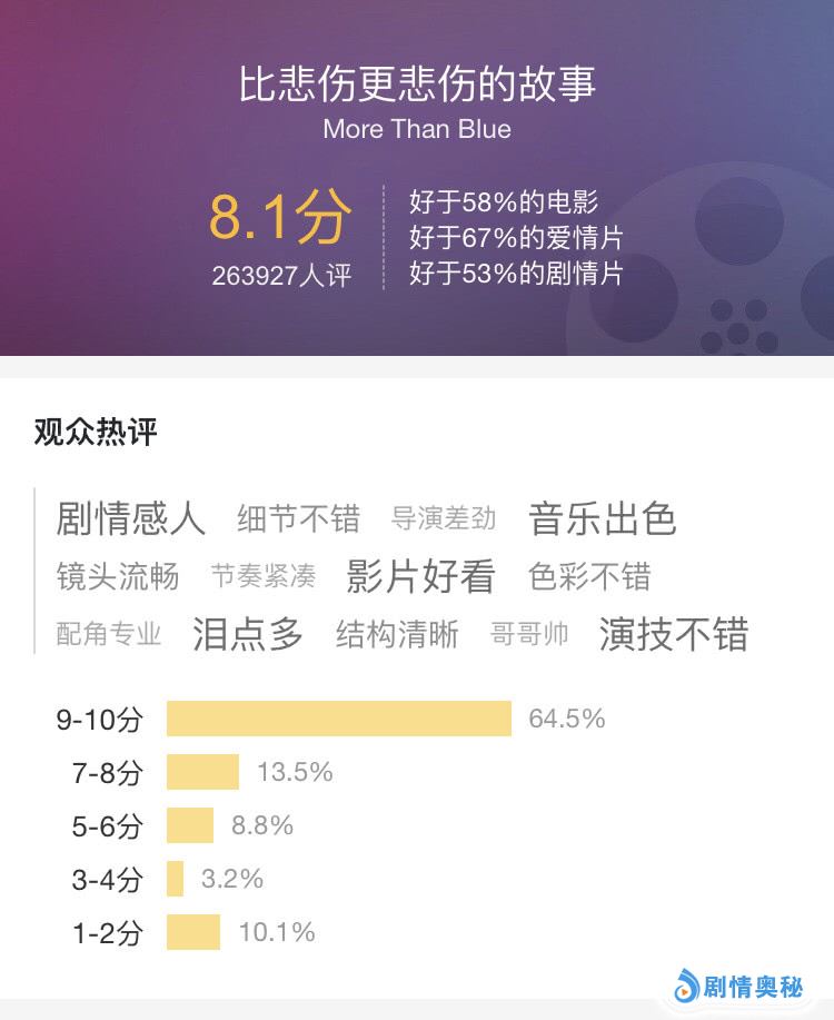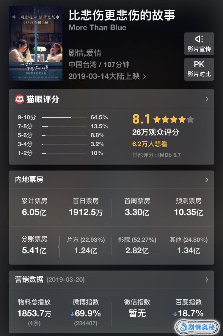 电影在内地上映后同样受到了欢迎,目前《比悲伤更悲伤的故事》在猫眼的评分为8.1分,表现不错,观众们看完也是各种好评,“催泪神器”,“真的看哭了,好感动”,“剧情太虐了”。
