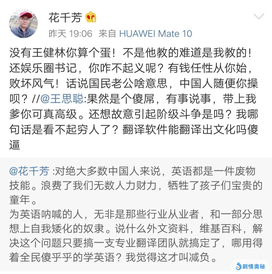 英语有没有用,可能是会有一部分人像花千芳这样认为的。不过相信大部分人会觉得英语有用,毕竟书到用时方恨少、中国也要走向国际化,所以作为“检举人”的王思聪在认为花千芳错了,以他一贯作风,他就是直接怼花千芳,骂他“9102年都没有出过国的傻屌”。
