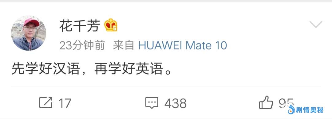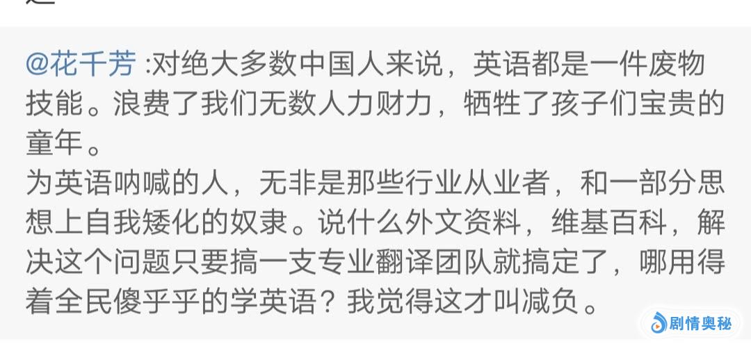 近日花千芳就该不该学英语,在网上发表了一篇文章。他文章写道,英语是一项废物技能,它只合适一小部分从业者,它不仅浪费了我们大量的人力和财力也还牺牲了孩子们的宝贵时间……