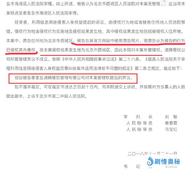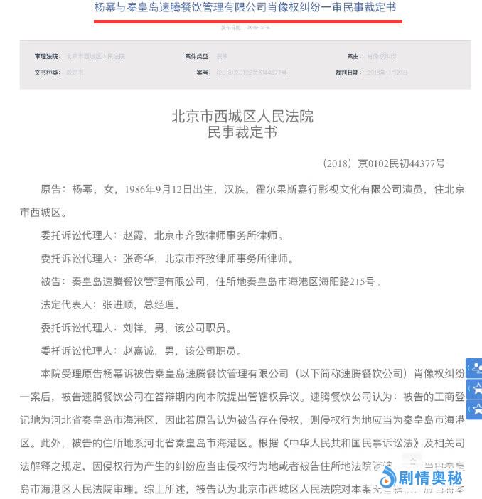 因为秦皇岛速腾餐饮管理有限公司未经过杨幂方同意,擅自使用杨幂照片和图片作为公司广告宣传,因此杨幂方面提出起诉。但是被告公司提出管辖权异议,北京西城区法院审理后,驳回被告对本案管辖权的异议。