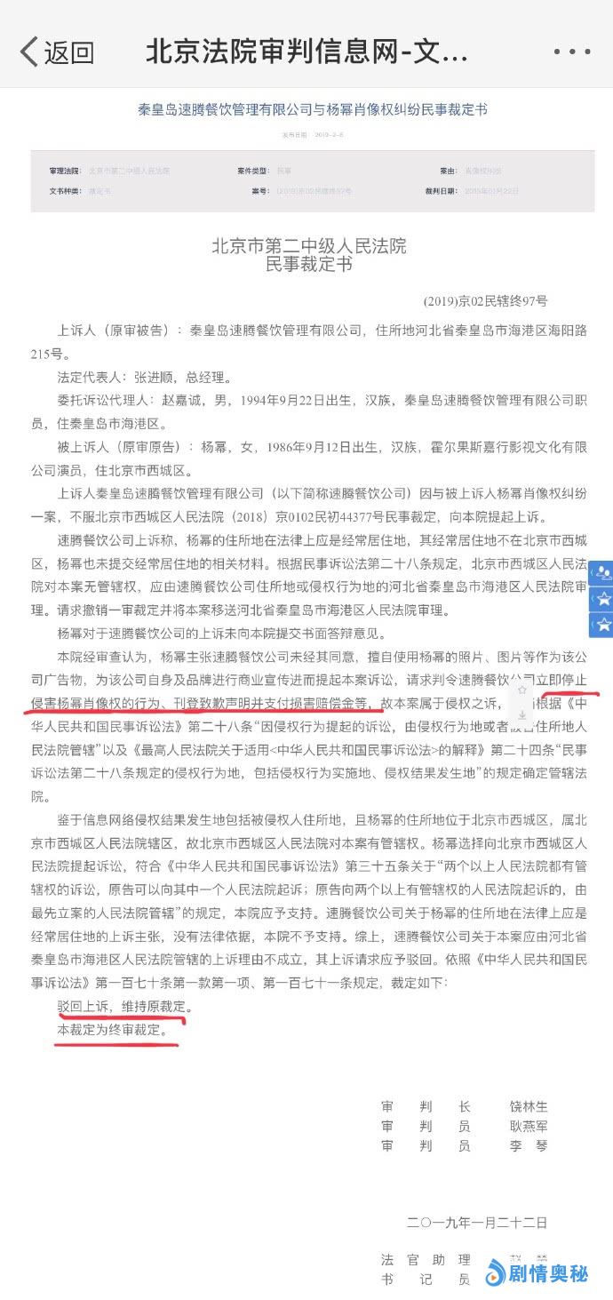 3月21号下午,有实名认证网友发布了杨幂肖像权官司最新结果,目前法院已经发布了民事裁定书。
