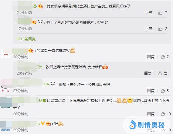 网友留言:其实很多明星到期代言还挂着广告的……我看见好多了!希望能一直这样维权!驳回上诉维持原裁定,支持维权!那接下来处理一下公关和反黑吧!重点是不服法院裁定,提起上诉被驳回!不管是哪方面的,只要维权了就是好事!这种事情应该继续做下去,维权很重要。