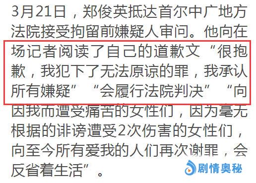 3月21号,郑俊英公开发布道歉声明:很抱歉,我犯下了无法原谅的罪,我承认所有嫌疑,会履行法院判决!向因我而遭受痛苦的女性们,因为毫无根据的诽谤遭受2次伤害的女性们,向至今所有爱我的人们再次谢罪,会反省着生活。