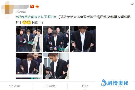 据悉,郑俊英结束审查后双手被绳子捆绑,正式转移到拘留所羁押。郑俊英在宣读道歉文时,他的手是可以自由活动的,不受限制,现在被警用绳子捆绑了,这是在按照法律程序操作。