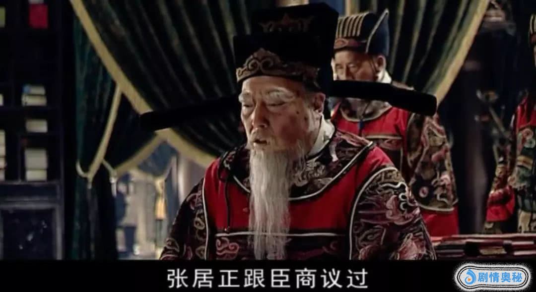 看看下面这阵仗,左边一排是司礼监,右边一排是内阁,中间那个是为首的内阁阁老严嵩(倪大红饰)。