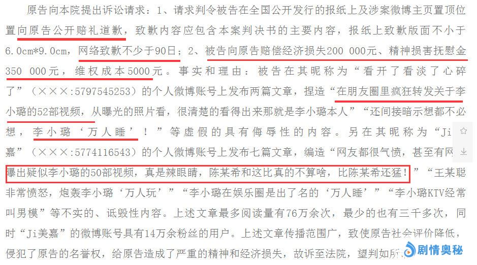 李小璐委托律师事务所起诉被告,是因为被告发布了很多不实言论和内容,捏造如下内容:李小璐52部视频,李小璐万人睡,视频辣眼睛比陈冠希还猛,李小璐KTV叫男模等。李小璐方面索赔20万经济损失赔偿,还有精神损害抚慰金35万,维权成本5千。
