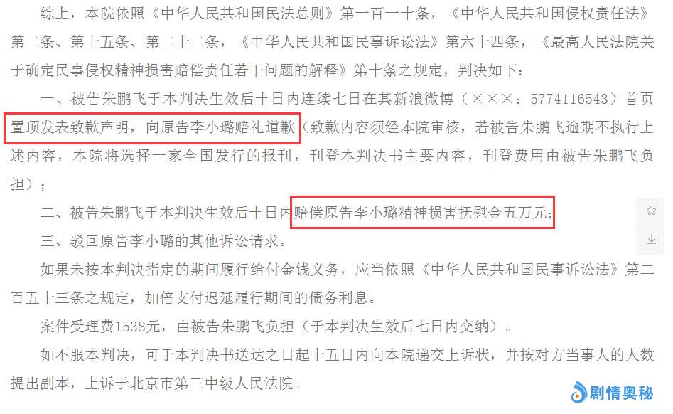 北京朝阳区法院判决如下:第一,被告连续7天置顶道歉声明,向李小璐赔礼道歉。第二,被告赔偿李小璐5万元精神抚慰金。第三,驳回李小璐其他诉讼请求。如果被告不服本判决,可在15日内递交上诉状,上诉到北京市第三中级人民法院。