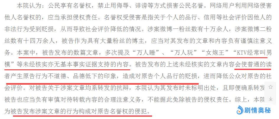 经过法院依法审理,法院认定被告提及的“万人睡”、“万人玩”、“女炮王”、“KTV叫男魔”等内容都没有事实证据支持,使读者产生原告行为不道德、品德低下的印象,认定被告发布的内容构成对原告李小璐名誉权的侵犯。