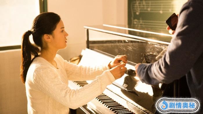 剧照中呈现的是女主角夏乐作为一位盲人音乐老师给孩子们弹钢琴的一场戏。画面中出现了很多人学生时代最熟悉不过的道具符号:讲台、黑板、粉笔字、以及钢琴、五线谱等最常见的课堂元素,黑板上还用歪歪扭扭的白色粉笔字写着经典童谣《送别》的歌词,几组简单朴素的校园怀旧写意具象场景加上女主清新脱俗、恬静淡然的气质营造出非常唯美的诗意氛围,使得《站住!小偷》这部被传主打搞笑接地气的影片又多增添了几分青春气息。