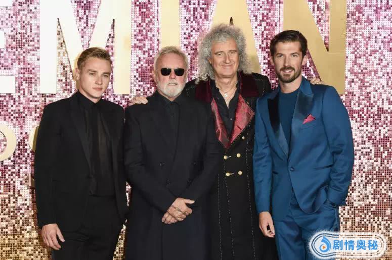皇后乐队吉他手布莱恩·梅(右二)与鼓手罗杰·泰勒(左二)与在《波西米亚狂想曲》中分别扮演他们俩的格威利姆·李(右一)与本·哈迪(左一)