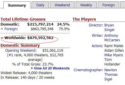 《波西米亚狂想曲》失败让不少观众跌破眼镜,这是去年最具影响力的现象级电影之一,影片制作成本仅5200万美金(约合3.4亿人民币),然而却在北美狂收2.1亿美金票房(约合14亿人民币),曾拿下北美周末票房冠军!