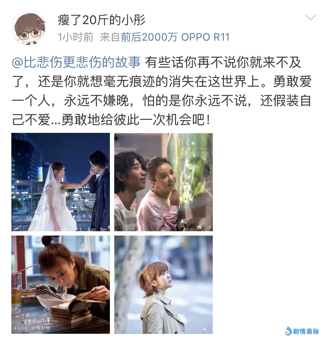 正在热映的年度最催泪爱情片《比悲伤更悲伤的故事》继观影必须携带大量纸巾之后,又被观众们总结出了一条建议:素颜去看更合适,不要化妆,才好尽情流泪!该片的女性观众众多,看完后哭花妆的大有人在,催泪指数满分。