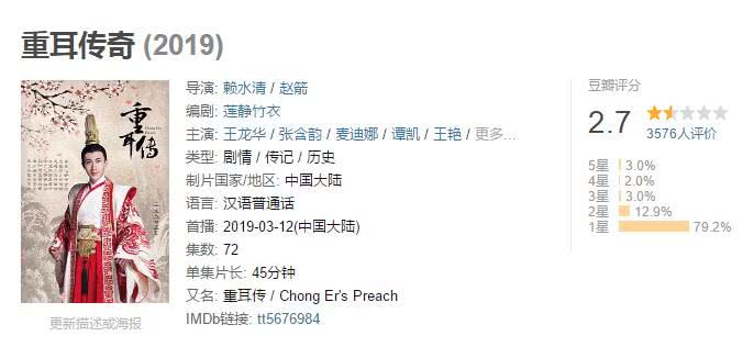 现在古装剧能上星级卫视播出的机会非常少,这么宝贵又难得的机会,让拥有众多老戏骨当配角的《重耳传奇》拿到了,3月12日在浙江卫视播出,同时在多家视频网站上线,然而先天条件如此好的剧,却成了2019年豆瓣评分最低的烂剧。