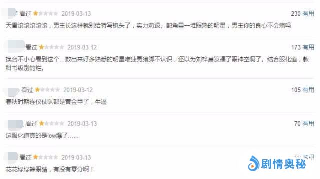 豆瓣上热度最高的五个评价,全部都是一星,吐槽花花绿绿服化道,男主角颜值低没演技没知名度,还有春秋时期连仪仗队都是黄金甲扭曲历史,如果豆瓣评分有零分和负分,这部剧很有可能拿不到分数。