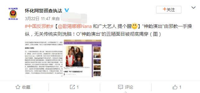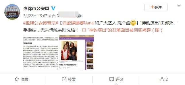 3月22号,中国反邪教官方账号率先发声,公开谴责欧阳娜娜和她的母亲傅娟,因为他们去亲自欣赏某邪教违法演出活动,艺人欧阳娜娜也去看过。随后盘锦市公安局、怀化网警巡查官博等多个警方官博纷纷站出来,集中炮轰欧阳娜娜和她母亲非法行为。但是,欧阳娜娜工作室开始反驳官媒的批判了。