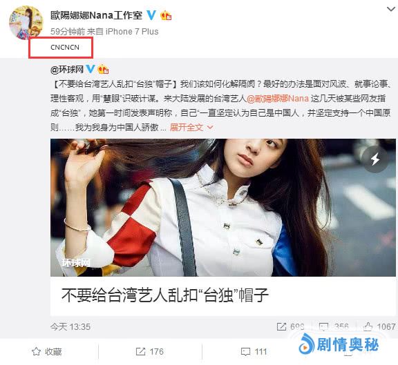 3月23号,欧阳娜娜工作室转发了一条消息,某网站说:不要给台湾艺人乱扣TD帽子!工作室发文:cncncn!再次洗白叫嚣自己是中国人!呵呵,工作室还在洗白呢?中国反邪教官博都盖章了,欧阳娜娜还在苦苦挣扎?