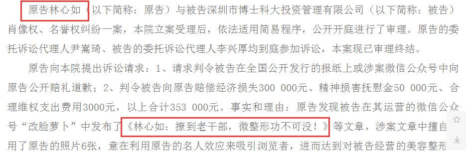 3月20日,北京法院官网公布了林心如与某投资管理公司肖像权纠纷一审民事判决书,被告造谣林心如做过微整形,直言林心如依靠微整形追到老公霍建华。林心如起诉到法院索赔35.3万,经审理判定被告侵犯林心如肖像权,宣判被告赔偿林心如3万元。