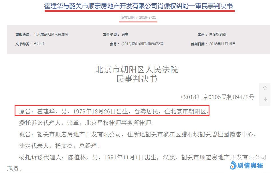 继林心如维权胜诉后,霍建华也开始大规模集中维权,3月21号,北京法院官网公布了霍建华与某房地产公司肖像权纠纷一审民事判决书。北京朝阳区法院公开开庭审理,原告霍建华诉讼代理人到庭参加庭审!