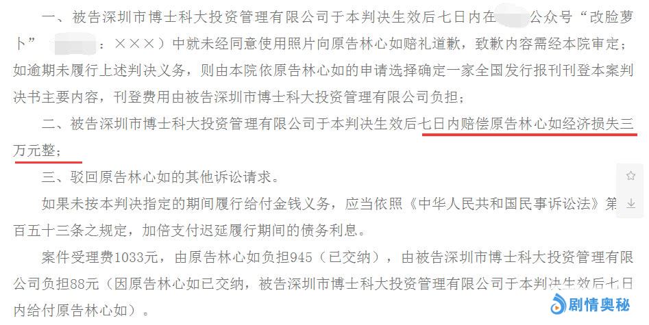 北京朝阳法院依法审理,认定被告行为构成对原告林心如肖像权的侵害,应承担侵权责任。法院宣判被告在7天内赔偿林心如经济损失3万,驳回林心如其他诉讼请求。