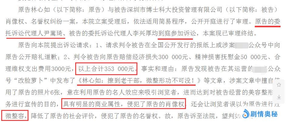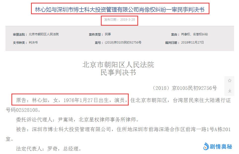 3月20号,北京法院官网公布了林心如与深圳市博士科大投资管理有限公司肖像权纠纷一审民事判决书,审理法院是北京朝阳区人民法院,原告是林心如本人。林心如没到场出庭,其代理任到庭参加诉讼。