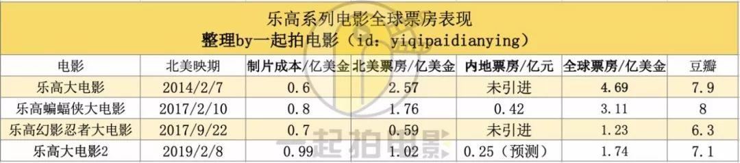 这已经不是第一部在内地票房扑街的“乐高”系列电影。2017年3月,豆瓣高达8分+的《乐高蝙蝠侠大电影》也曾在内地上映,最终首日票房仅有390万,是同日上映的《金刚狼3:殊死一战》的3%,最终4200万的票房成绩,位列当年好莱坞进口动画票房榜最后一位。如果不出意外,《乐高大电影2》也要在今年继续保持这一成绩。