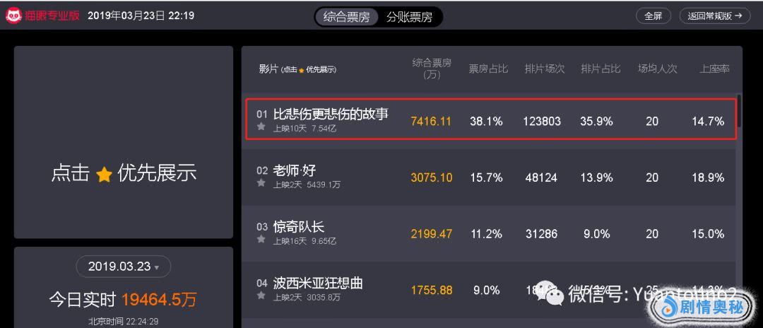 作为3月档期中票房黑马,《比悲伤更悲伤的故事》从3月14日上映至今,根据猫眼专业版实时票房数据显示,截止发文时间,影片累计总票房已经突破7.54亿,排片场次高达123803,占日排片场次比35.6%,场均人次20人,上座率14.7%,而且在日票房上更是一度突破7400万,占日票房比高达38.2%,除了碾压3月22日上映的《老师·好》等多部影片,甚至连续一周稳居日票房榜首位置。