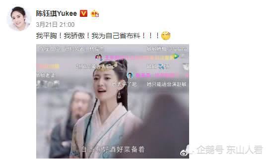 陈钰琪:“我平胸!我骄傲!我为自己省布料。”还把网友的弹幕截图出来。如此淡然的态度,也实在是太可爱了。