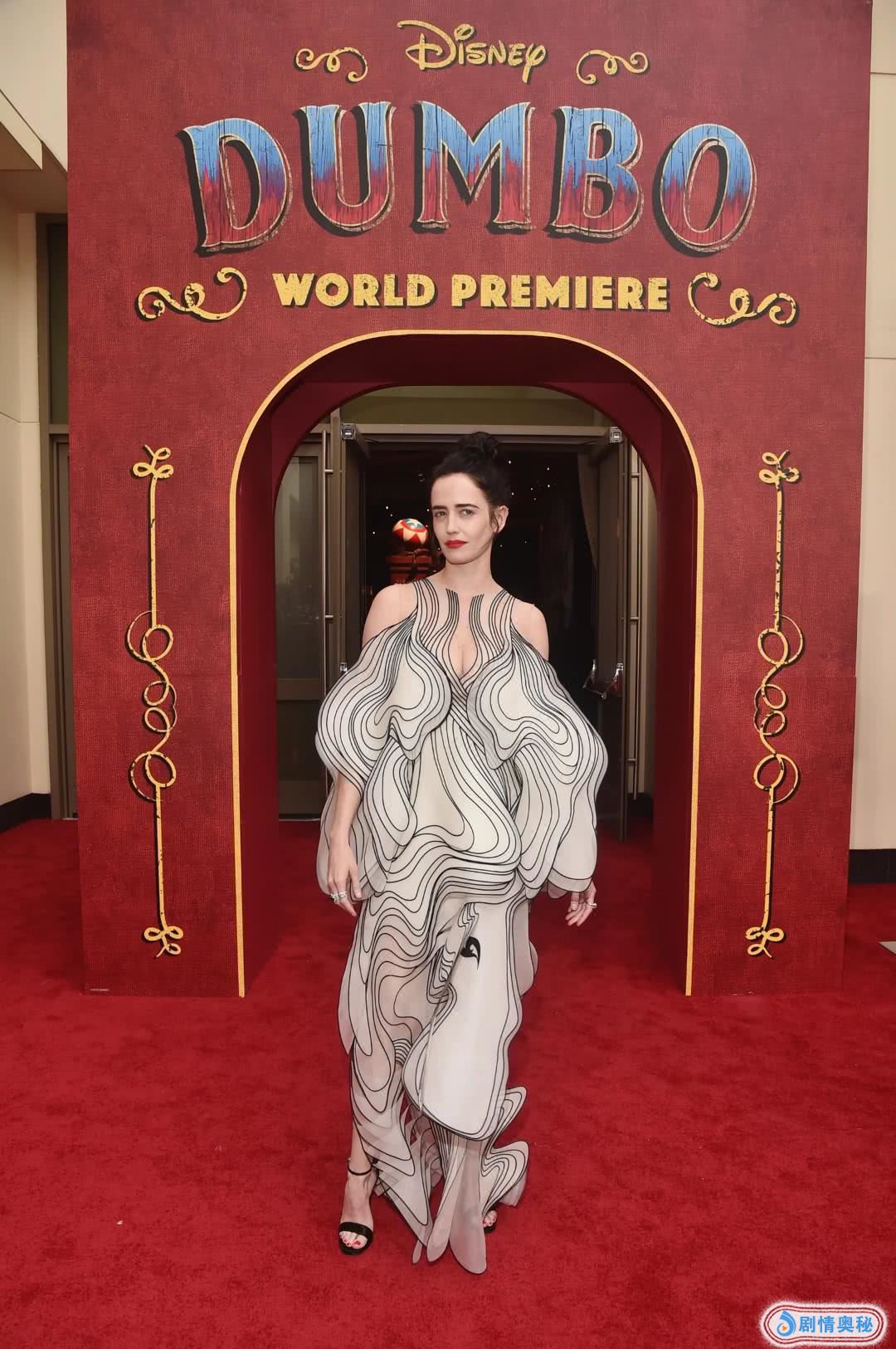 巴黎首映礼现场,爱娃·格林身穿一袭魅惑大气的长裙,与蒂姆·波顿的黑色绅士西装相得益彰,小飞象的到来也给这座浪漫之城增添了一丝梦幻。