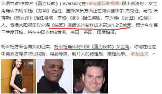 而在此前的香港影展上,也确定杨采钰下一部的电影作品是投资1.2亿美元的电影《重力反转》,这也是一部大制作,目前还处在前期在前期筹备阶段。