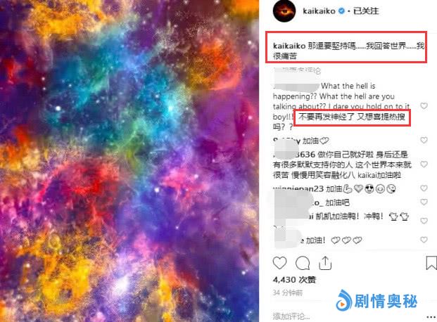 这一张惊悚的照片是柯震东上传到某社交平台的,太吓人了,似乎暗示着柯震东在苦苦挣扎。下面这个图片也是柯震东发布的太空星系照片,他自己反问说:那还要坚持吗?我回答世界,我很痛苦!网友再次怒斥:不要发神经了,又想喜提热搜吗?