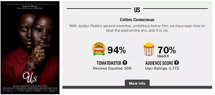 这部新片口碑处于中上水平,烂番茄新鲜度高达94%,基于309个专业媒体的评价得出的成绩。